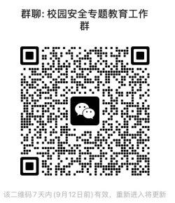 各学院可结合入学教育,在军训期间同步开展相关活动,也可于国庆节后通过主题班会、专题讲座等形式进行。请各学院于910日前指定一名负责人,并扫描附件中“校园安全专题教育工作群”二维码加入群组,以便后续协调与通知。