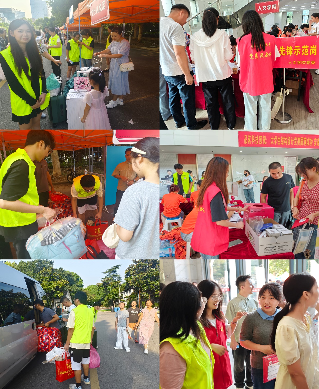 校园里,随处可见身着荧光绿马甲的志愿者忙碌的身影。他们是由“暖途”青年志愿者服务社、“阳光之旅” 青年志愿者服务队组成的迎新志愿服务队,从校门指引、行李搬运、报到流程讲解到宿舍安顿,提供“一站式”贴心服务。他们用热情的笑容和耐心的解答,消除了新生初来乍到的陌生与不安,用实际行动诠释了人文学院的互助精神与传承力量。与“荧光绿”相互呼应的是身着红色马甲、胸前佩戴党徽的“党员先锋示范岗”同学们。学生党员们亮明身份,值守在迎新关键点位,主动承担最繁重的任务,积极回应新生与家长的各类咨询,以高度的责任感和饱满的服务热情,展现了学生党员的先进性与担当精神,成为了迎新现场一道亮丽的风景线。