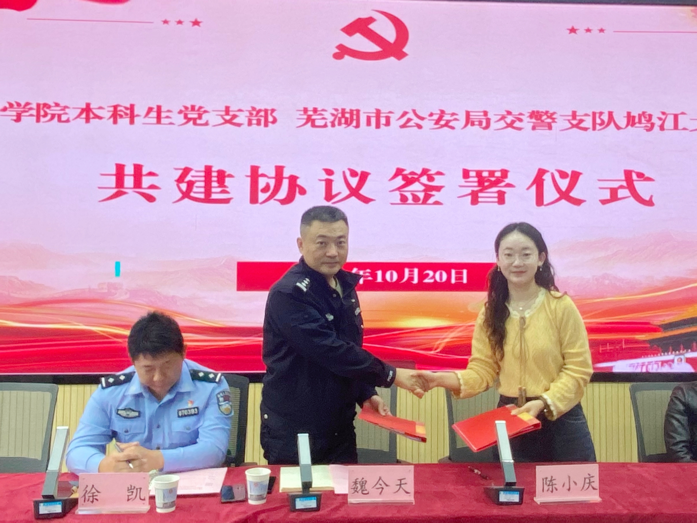 10月20日上午,外国语学院本科生党支部与芜湖市公安局交警支队鸠江大队党支部在九教209会议室举行党建共建协议签署活动。活动以党建为引领搭建警校合作桥梁,旨在强化学生党员党性修养,深化校地协同育人。外国语学院党委副书记李校林、鸠江交管大队大队长魏今天、鸠江交管三中队指导员徐凯、学院本科生党支部书记陈小庆及学院学生党员、入党积极分子代表共同参与。