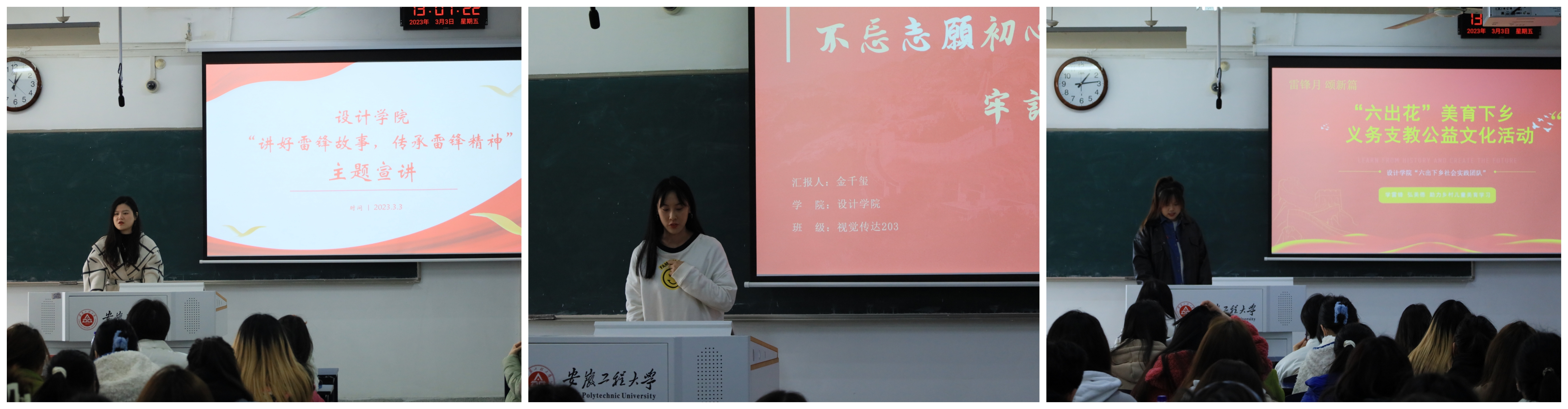 设计学院于3月3日在6J206举行“讲好雷锋故事,传承雷锋精神”主题宣讲活动,邀请第十一季“团百花”学雷锋志愿服务行动金银铜团队及十佳青年志愿者宣讲自己的志愿经验,传递雷锋精神。宣讲人通过自身的实践经验分享为同学们发扬雷锋精神提供新的学习思路,助力新时代青年更好地传承雷锋精神,鼓励同学们将雷锋精神内化于心、外化于行,谨记总书记的嘱托,立志做有理想、敢担当、能吃苦、肯奋斗的新时代好青年。