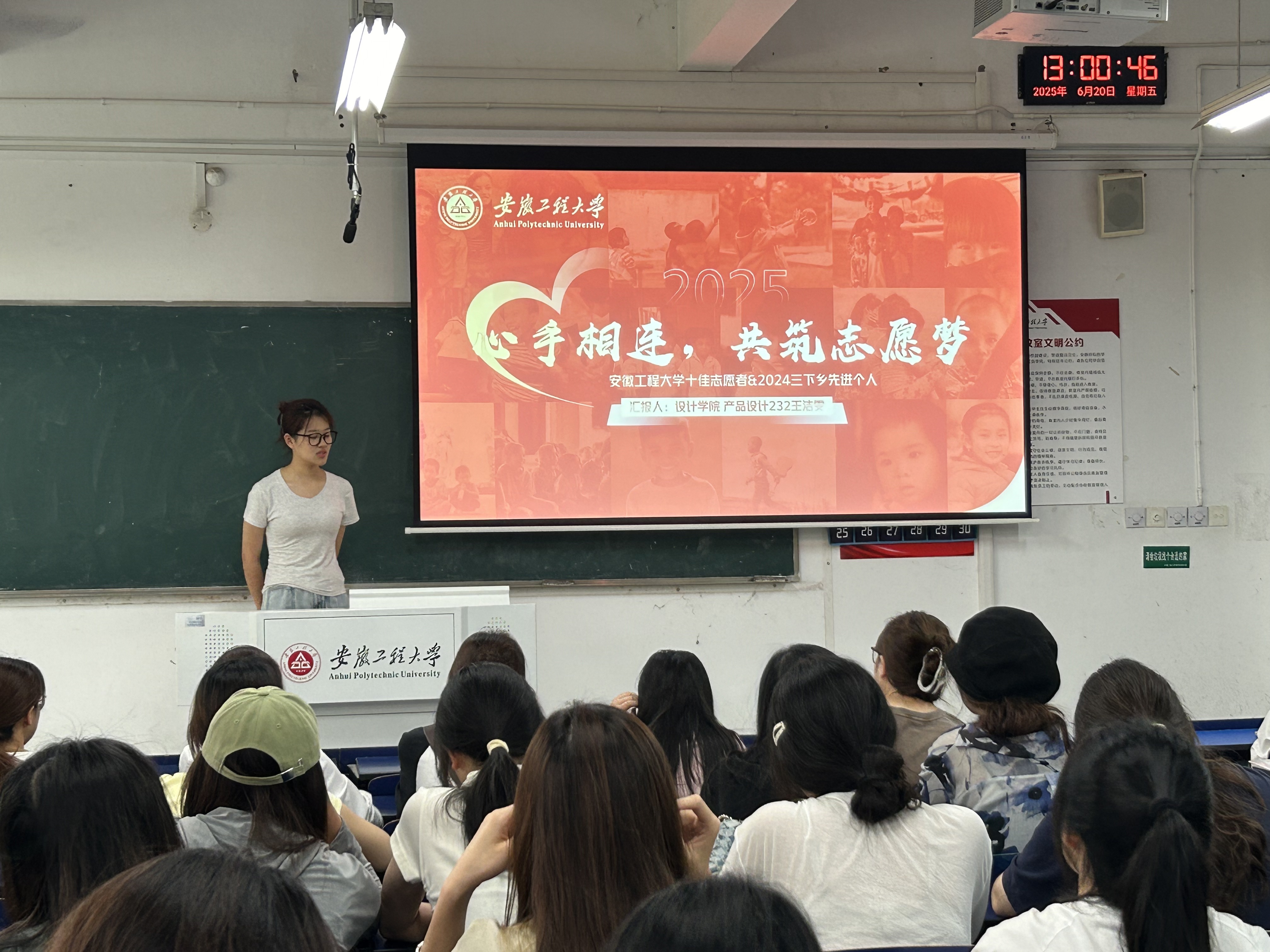 为了帮助同学们更好地开展实践活动,会议特别邀请了往届先进个人代表产设232班王洁雯同学进行经验分享。她结合自身团队的实践案例,详细介绍了实践项目的选题背景、实施过程、遇到的困难及解决方法,以及最终的成果转化经验,为即将踏上实践征程的同学们提供了有益的借鉴。